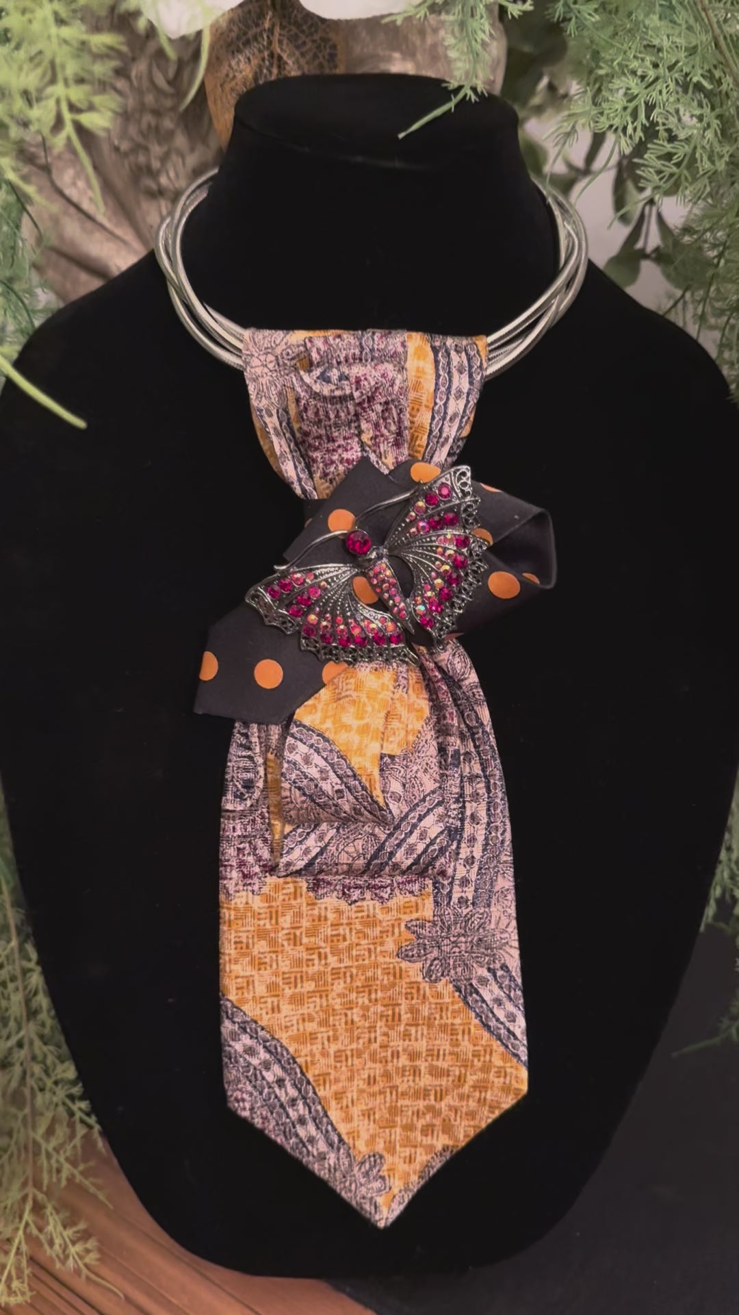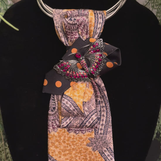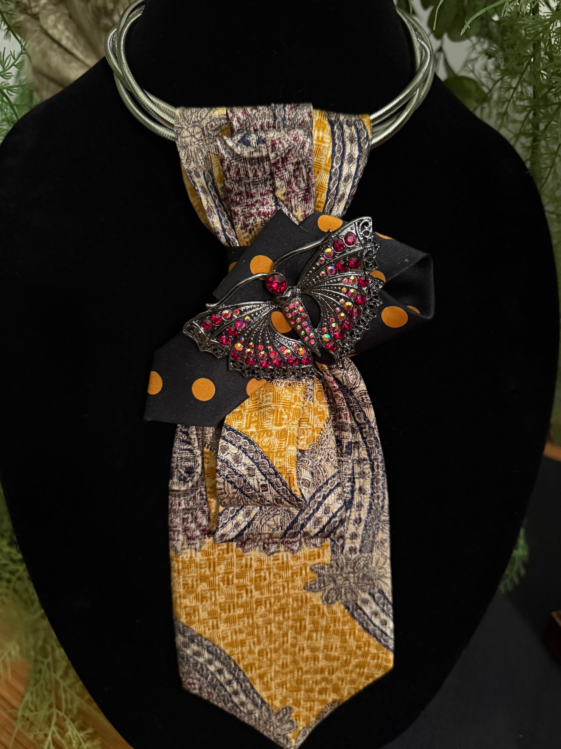 Mustard Yellow Paisely with a Splash of Black and Mustard Yellow Polka Dotted Contrast and the Unexpected Large Butterfly Brooch with Red Rhinestones