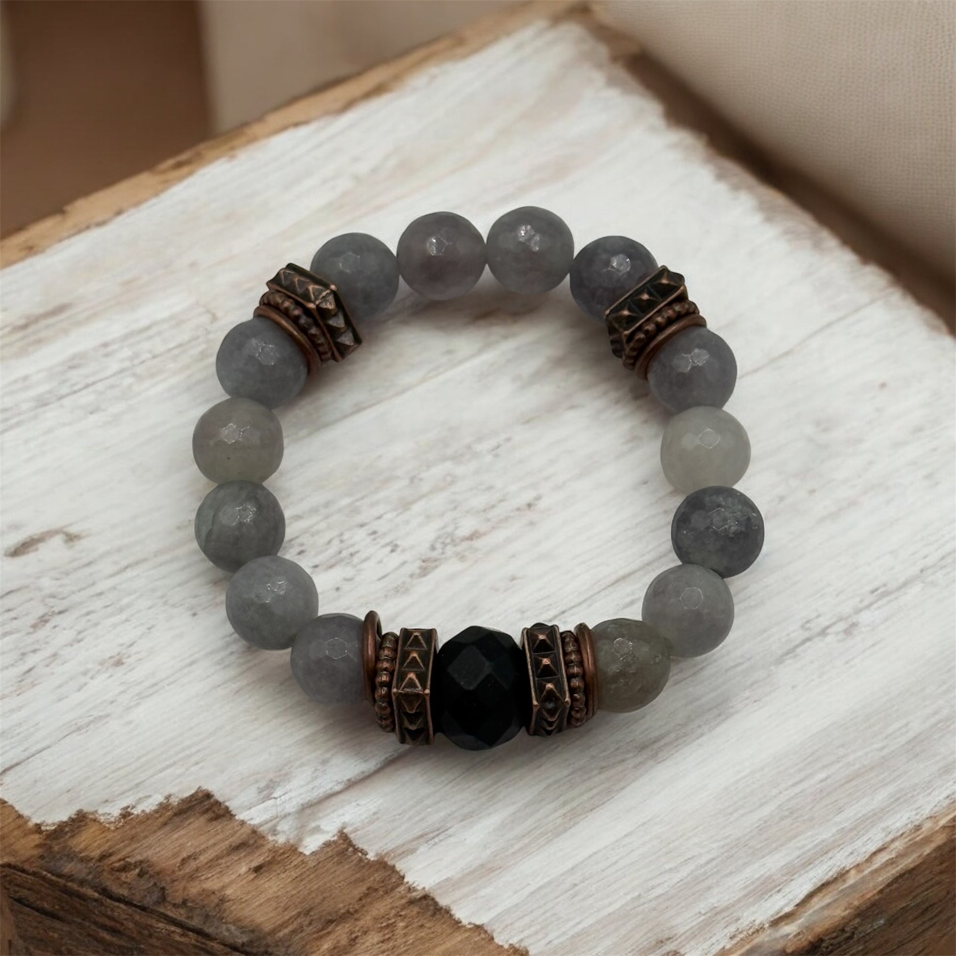 12mm Smoky Quartz with Matte Black Focal Point Adorned with Rose Gold Accents