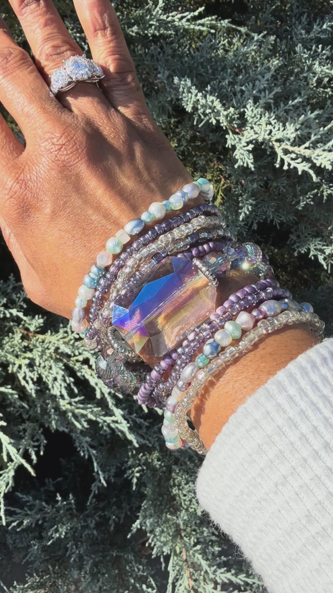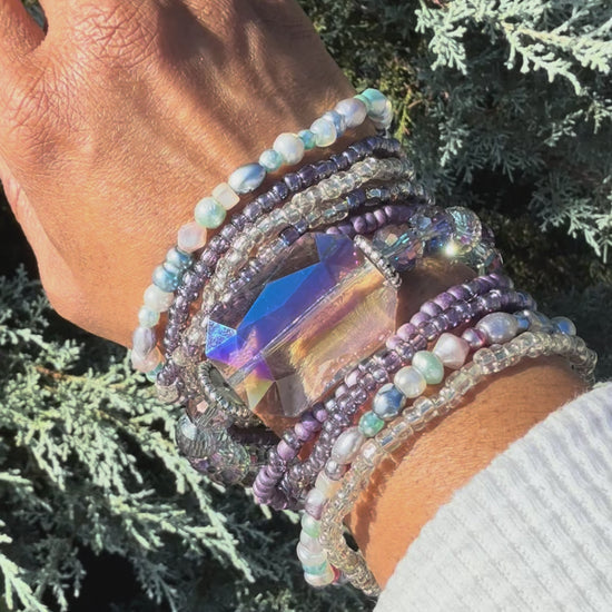 10 Piece Statement Stax of Iridescent Purple Glass Beads with Accents of Silver, Pearls and More