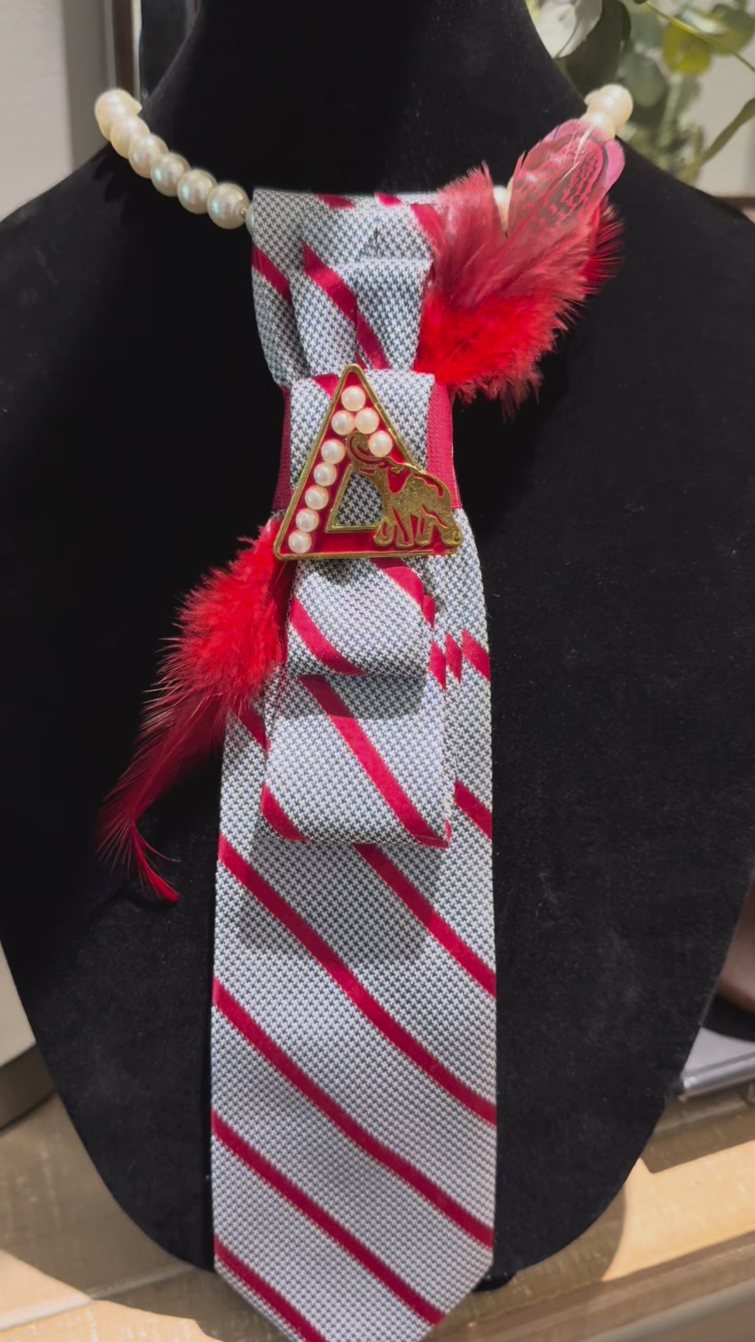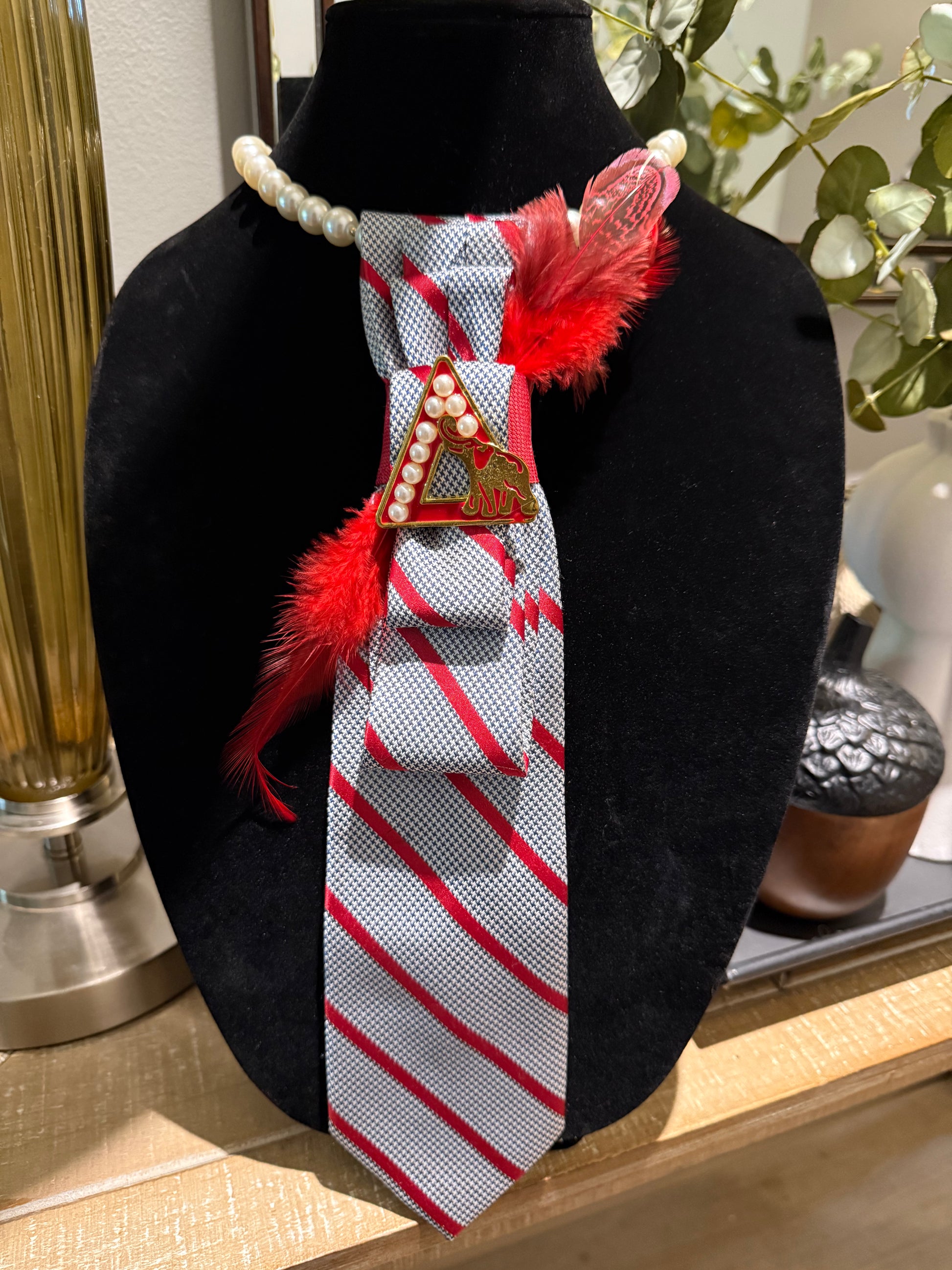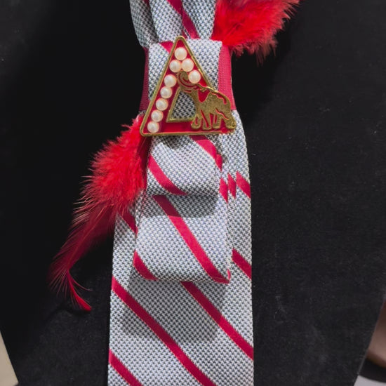Black and White Houndstooth with Gold Delta Brooch and Red Feathers