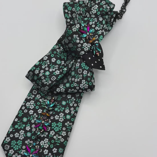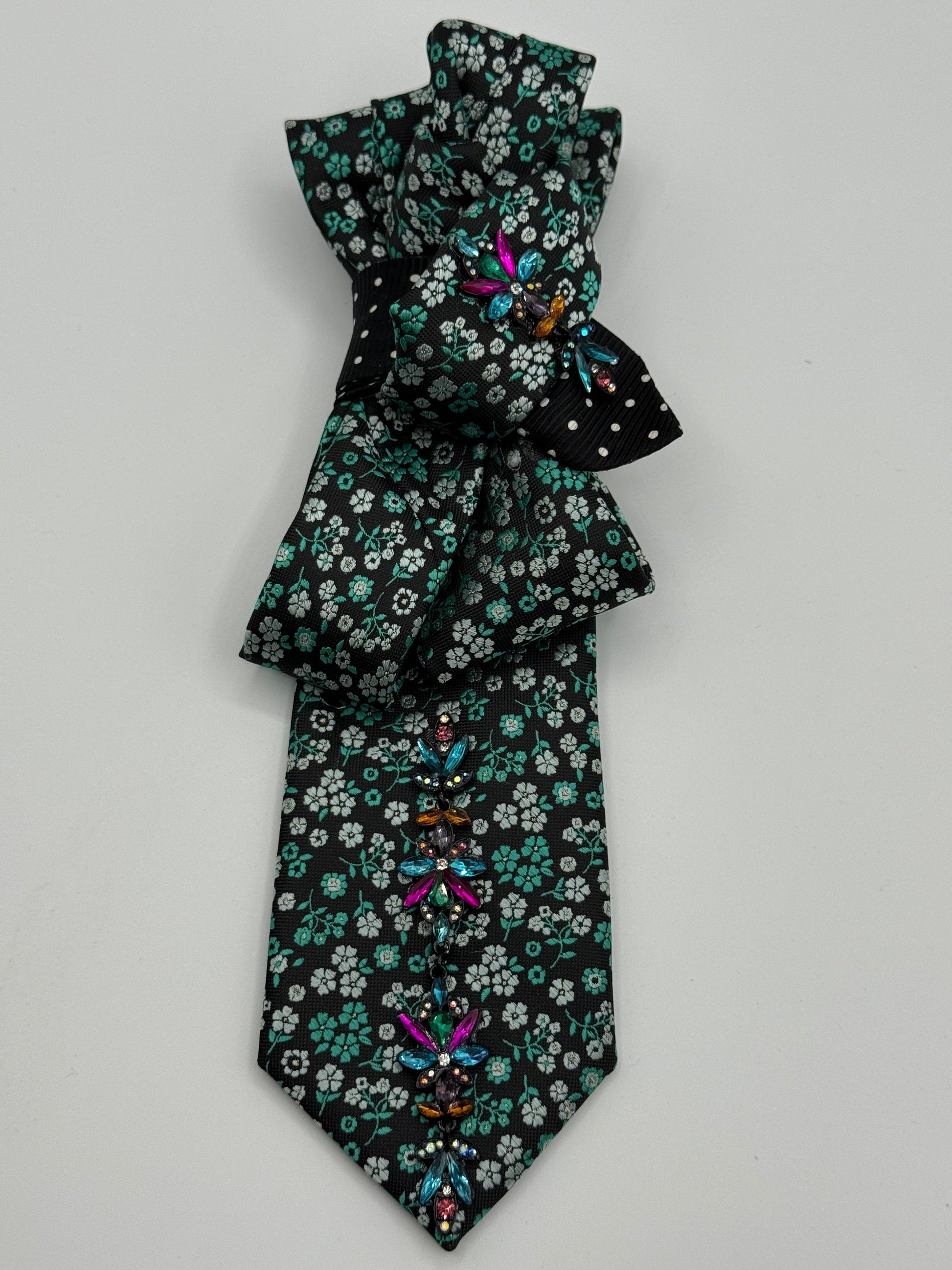 Black Tie with Teal Floral Pattern Accented by Black and White Polka Dots and SPLASH of color with Multi Colored Floral Rhinestone