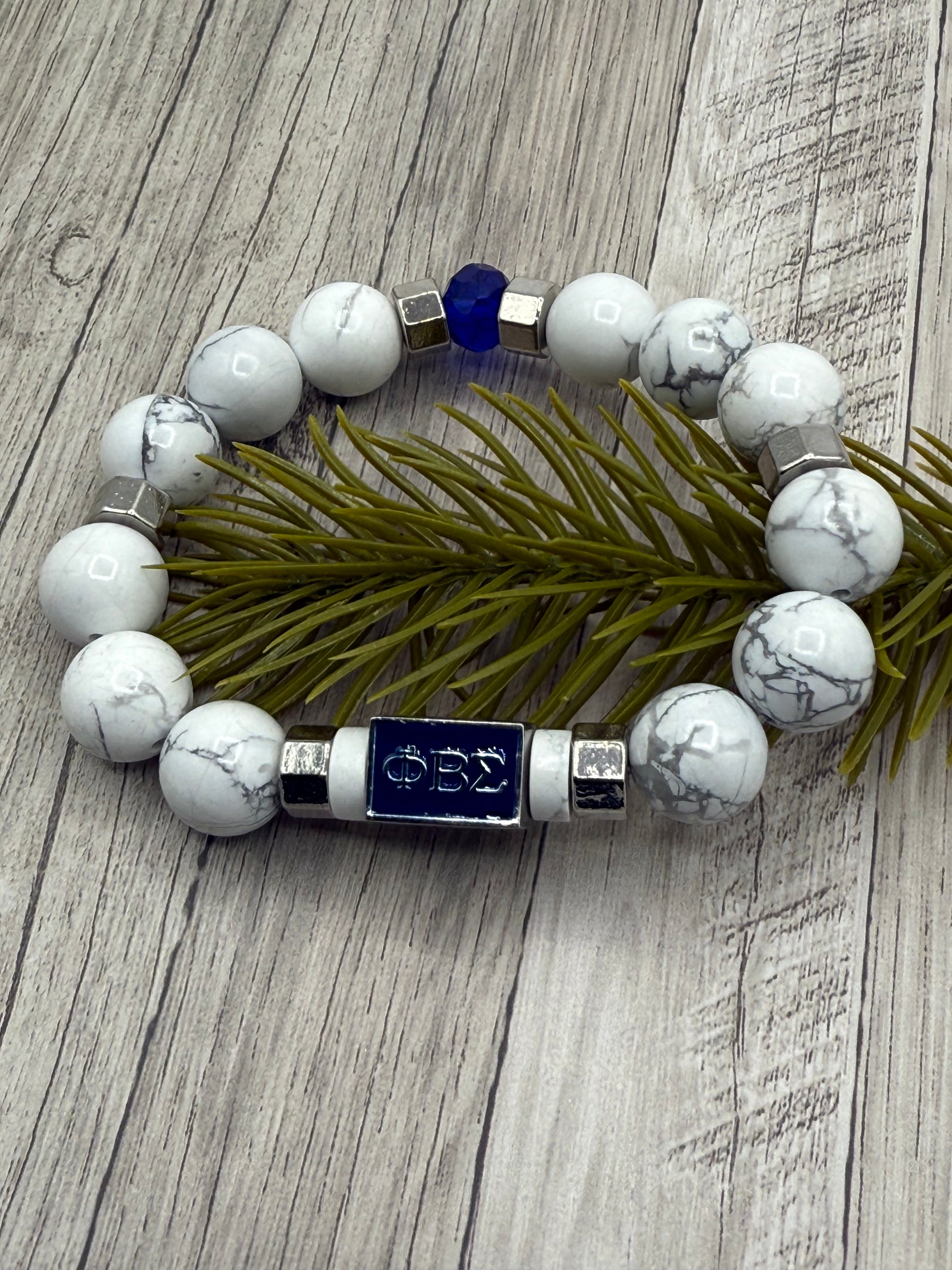 Large Marbled Howalite with Phi Beta Sigma Slide, Silver and Royal Blue Faceted Bead Accents