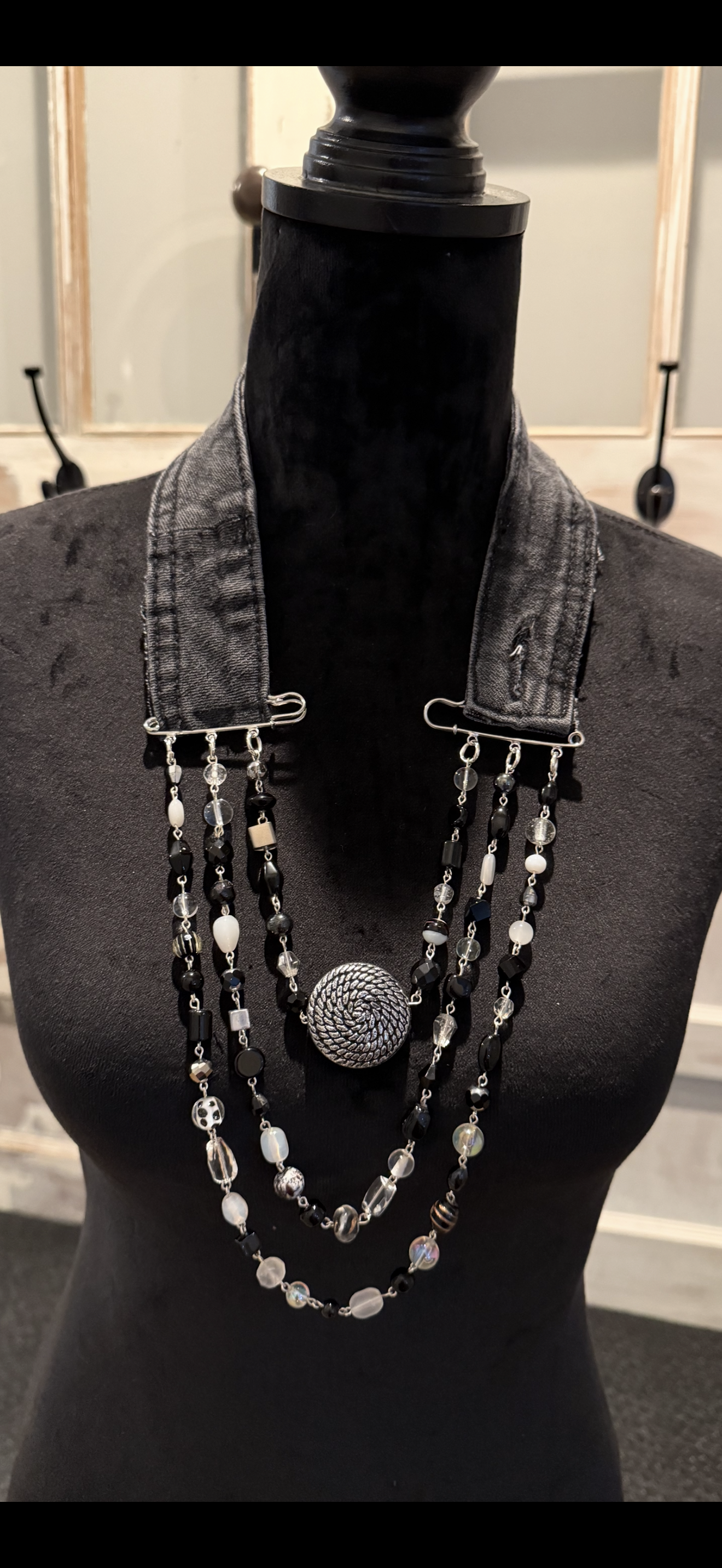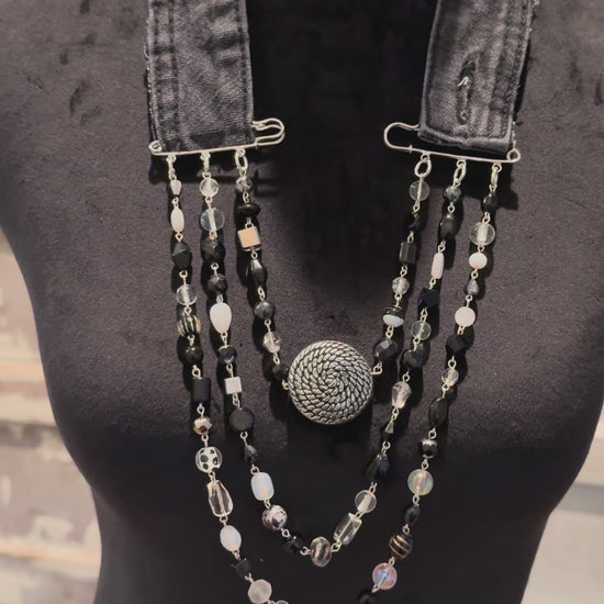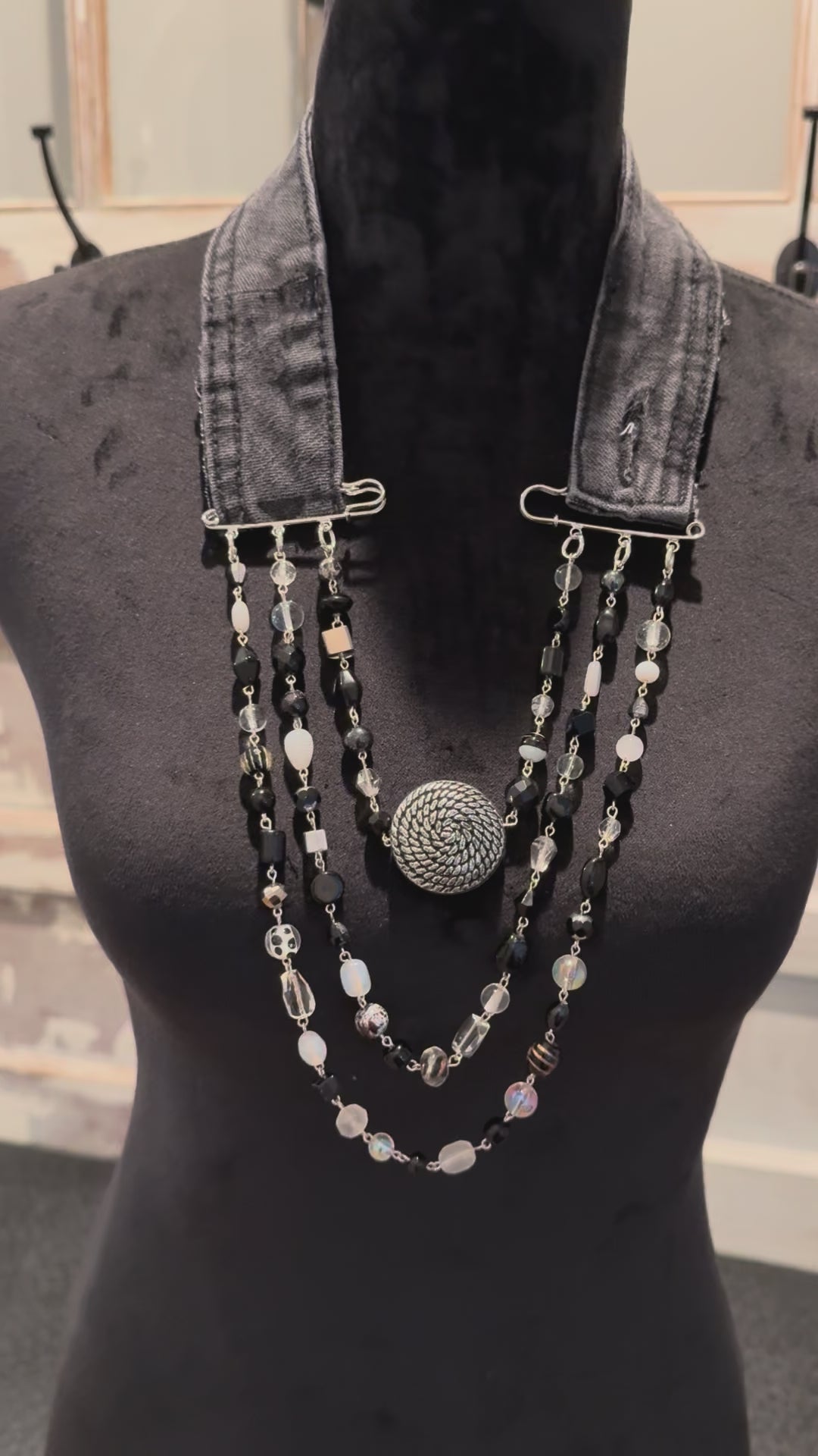 Black Denim Necklace with and Array of Black, Silver, Clear and White Glass Beads with Large Silver Medallion as an Accent Piece