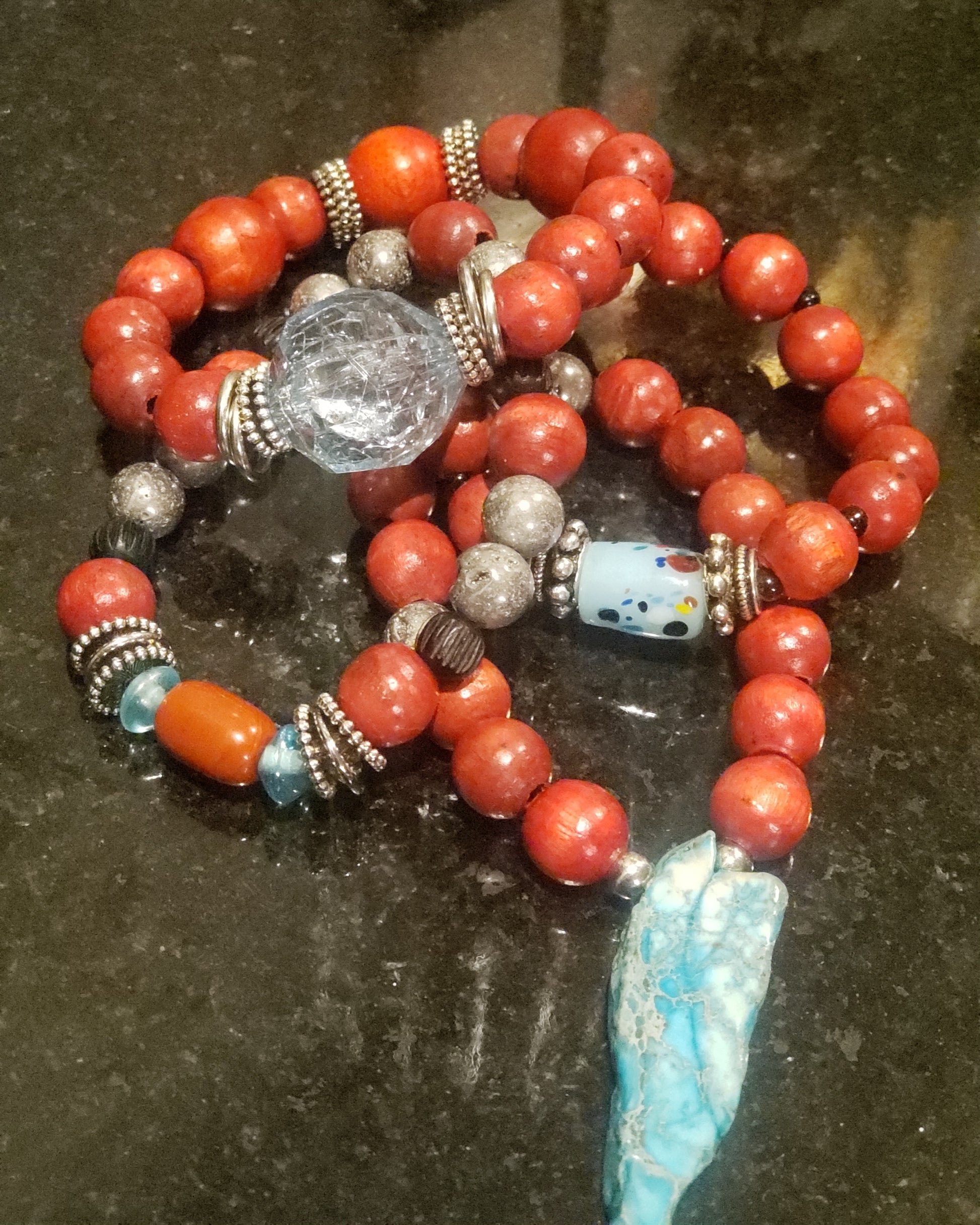 Red Wood Beads with Large Jasper Spike and an Array of Orher Beads
